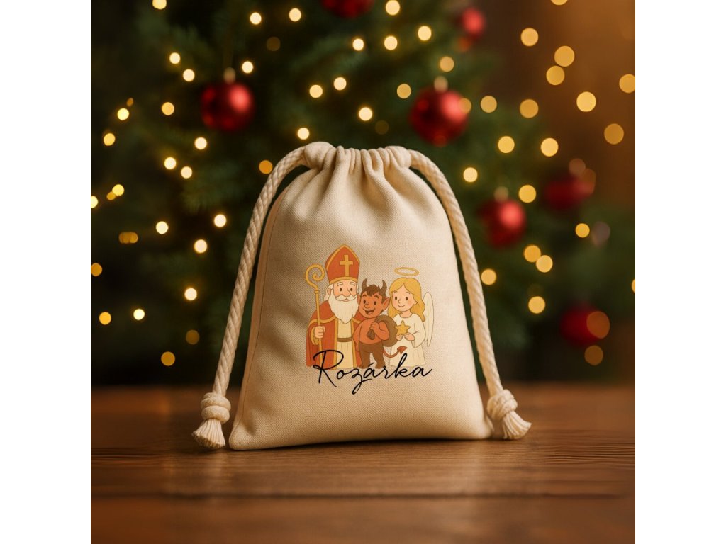 Mikulášský pytlík s potiskem Mikuláše, čerta a anděla s vlastním jménem