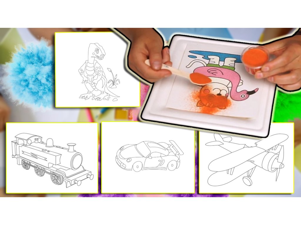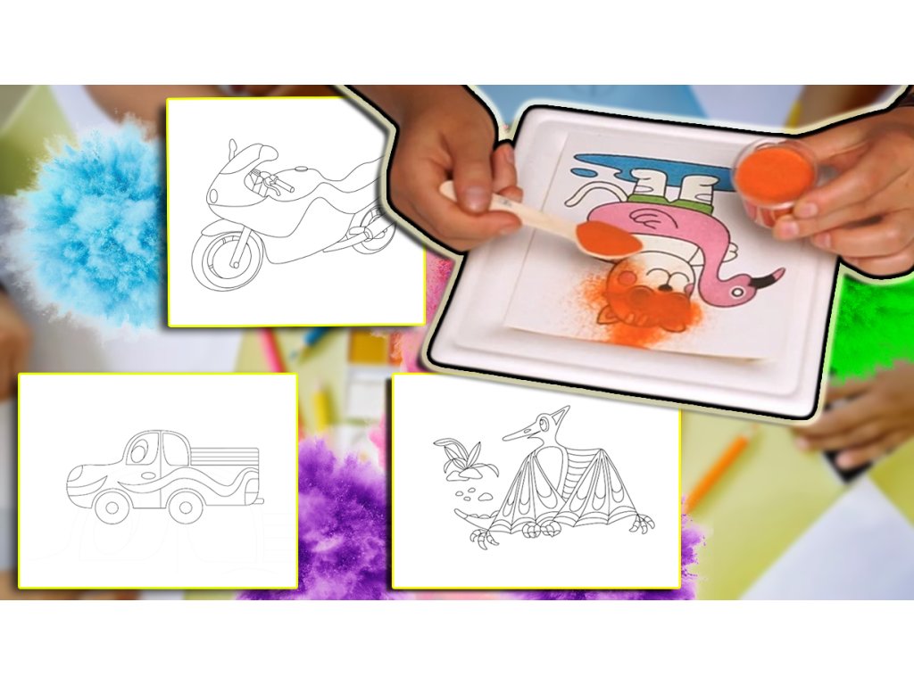 Sada 5 nebo 7 unikátních motivů (Lokomotiva, Dinosaurus Tyranosaurus Rex, Letadélko, Dinosaurus Pterodaktyl, Motorka, Nákladní autíčko a Závodní autíčko) s paletou 10 nebo 16 barevných písků obsahuje vše potřebné, aby jste mohli ihned začít tvořit. Je vhodná jako originální dárek nebo pro nové zájemce o tuto kreativní techniku tvoření s barevným pískem.